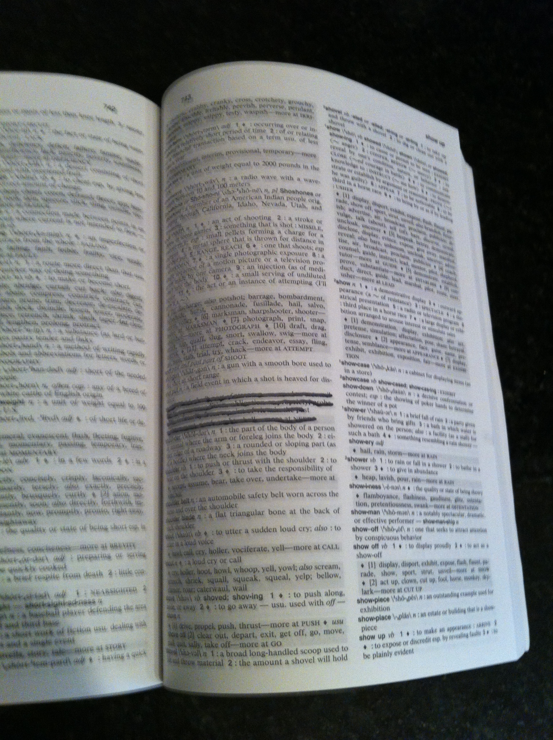 I have a combo dictionary & thesaurus that I carry (lug) around because I am interested in words – meaning, derivation, subtleties. Recently I removed the word “should” from my dictionary. I took a Sharpie and blacked it out as a ceremonial commitment to removing “should” from my vocabulary.