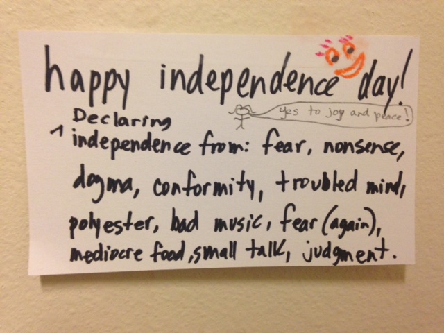 I wrote my own declaration of independence, too. First a backstory: at my house we have a tradition that when my husband is playing a gig (he’s a musician) and I go to bed before he gets home (which is almost every time) I leave him a love/welcome home note so he feels warmly welcomed home even though I am sound asleep. On July 3rd he had a gig and my note to him was my declaration of independence. Here it is: